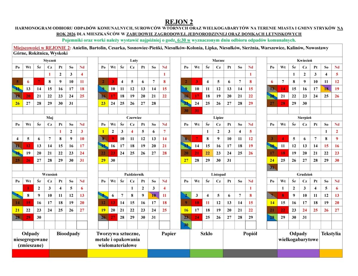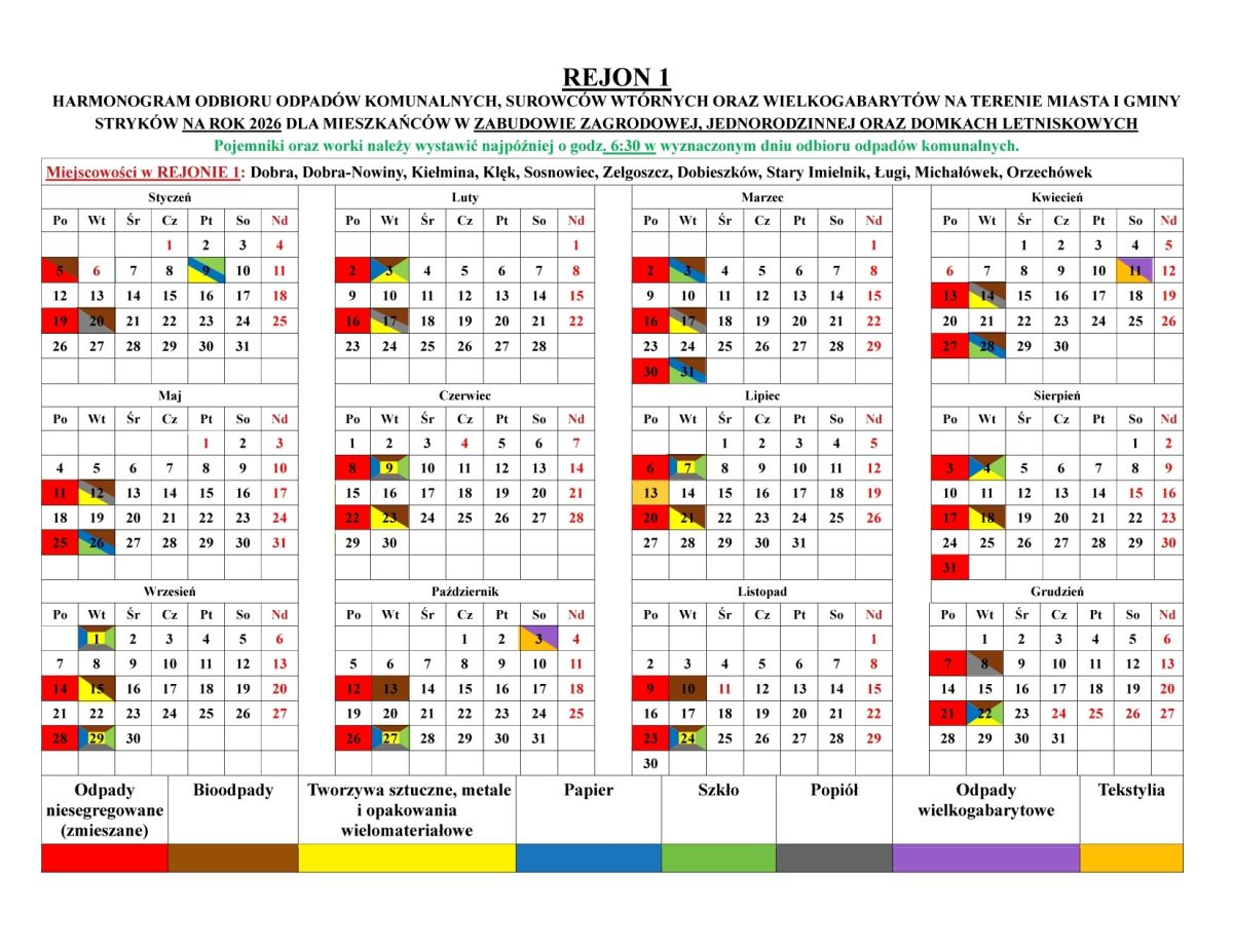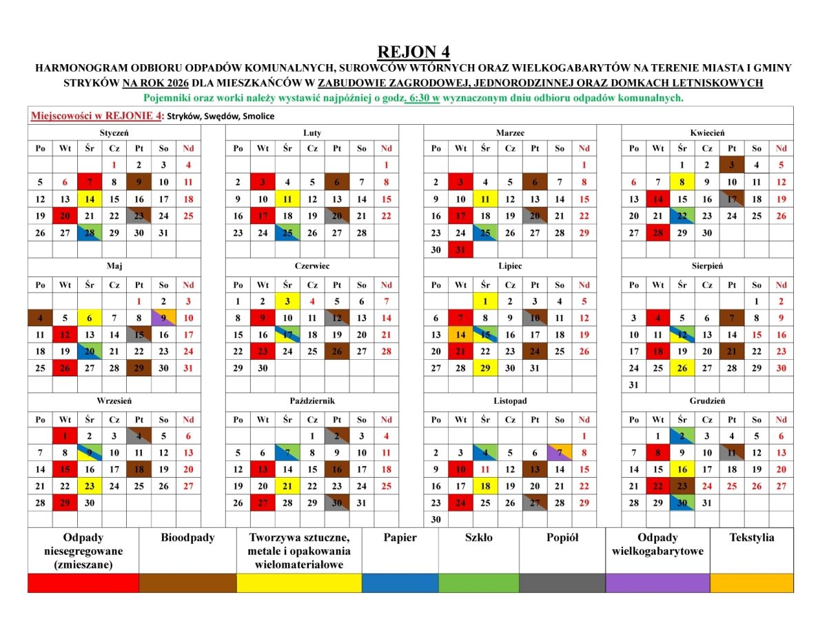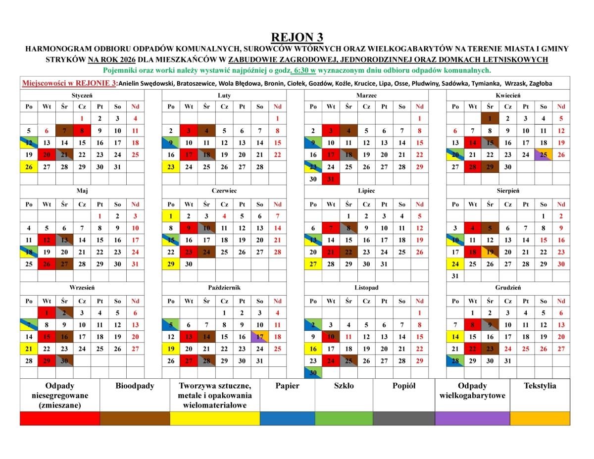 HARMONOGRAM ODBIORU ODPADÓW KOMUNALNYCH NA TERENIE GMINY STRYKÓW NA ROK 2026(kliknij na tabelę aby powiększyć)