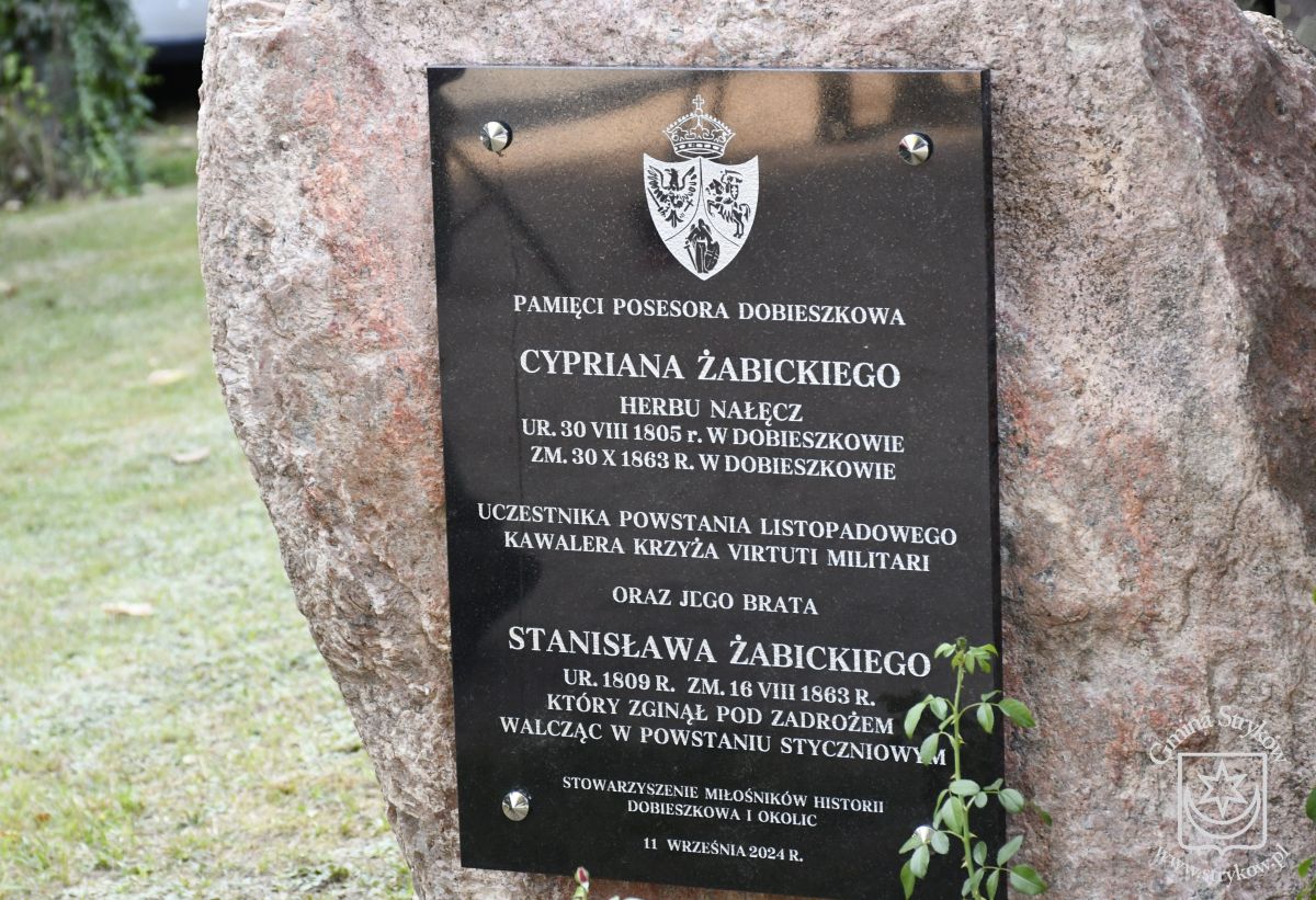 Tablicę upamiętniającą posesora Dobieszkowa Cypriana Żabickiego (1805-1863) oraz jego brata Stanisława (1809-1863), uczestników walk o wolność Rzeczypospolitej w Powstaniu Listopadowym oraz w Powstaniu Styczniowym odsłonięto dziś w Dobieszkowie. Pomysłodawcą i inicjatorem wydarzenia było Stowarzyszenie Miłośników Historii Dobieszkowa i Okolic, przy wsparciu Gminy Stryków. Honorową wartę przy obelisku, na którym umieszczono tablicę, zaciągnęli dziś kadeci klasy mundurowej ZS Nr 1 w Bratoszewicach, którzy to również dokonali symbolicznego jej odsłonięcia. Wyjątkowe życiorysy upamiętnionych dziś na trwale, do tej pory mało znanych postaci, wraz z rysem historycznym zrywów powstańczych 1831 i 1863 roku przybliżył zebranym Piotr Hubert Rodziewicz – historyk, członek Stowarzyszenie Miłośników Historii Dobieszkowa i Okolic oraz Towarzystwa „Strzelec”. Głos zabrał Burmistrz Strykowa Piotr Ślęzak, który podziękował za cenną dla kultywowania lokalnej pamięci historycznej kolejną już inicjatywę grona skupionego wokół Towarzystwa "Strzelec", a od niedawna również Stowarzyszenia Miłośników Historii Dobieszkowa i Okolic. Kwiaty i znicze w miejscu pamięci złożyli m.in.: Burmistrz Strykowa Piotr Ślęzak, przedstawiciele CKiW OHP w Dobieszkowie, ZS Nr 1 w Bratoszewicach, Klubu Biegowego Powstaniec, Stowarzyszenia Miłośników Historii Dobieszkowa i Okolic, Towarzystwa „Strzelec” i lokalnej społeczności. Tablicę pamiątkową pobłogosławił Proboszcz Parafii Wniebowzięcia Najświętszej Maryi Panny i Świętej Barbary w Starych Skoszewach ks. Robert Batolik.