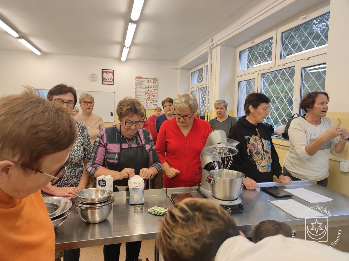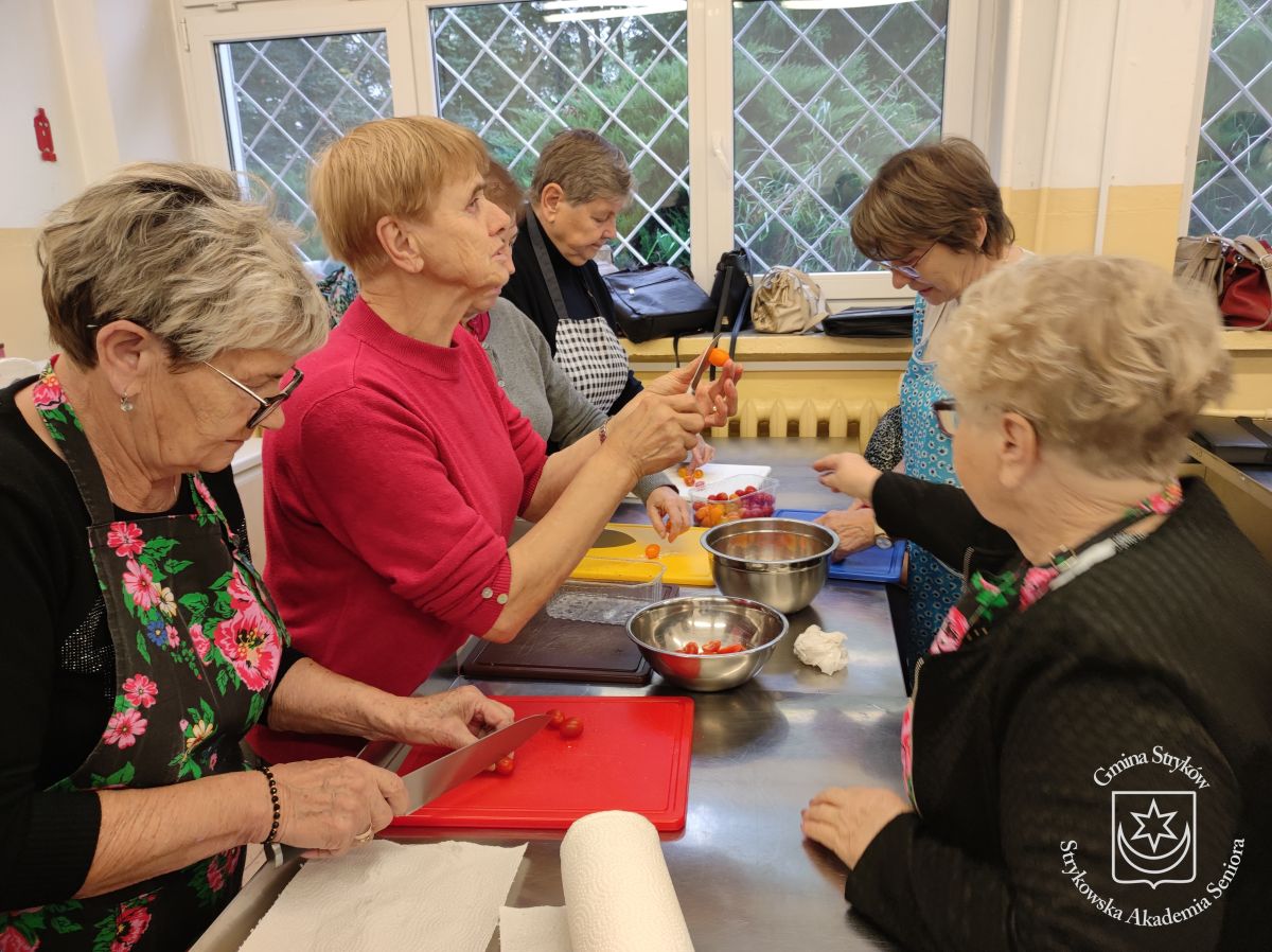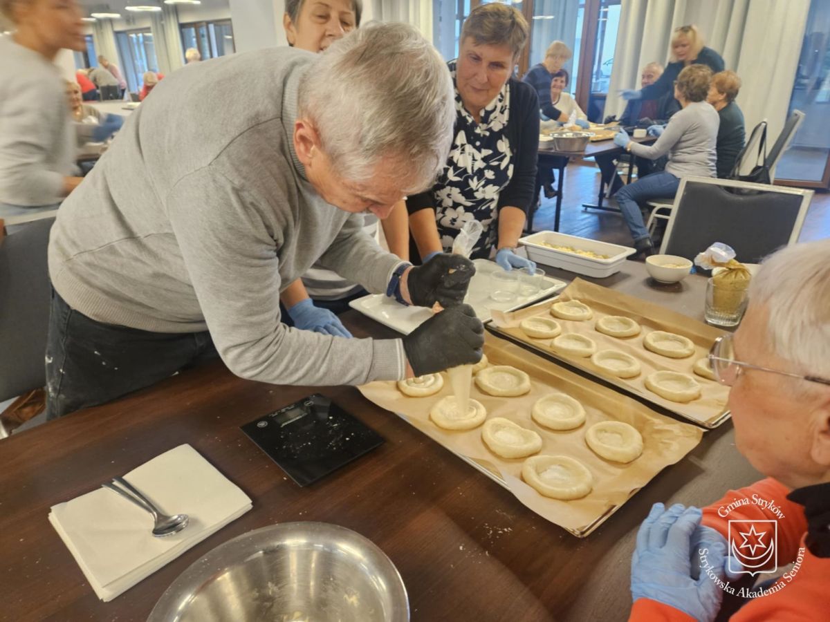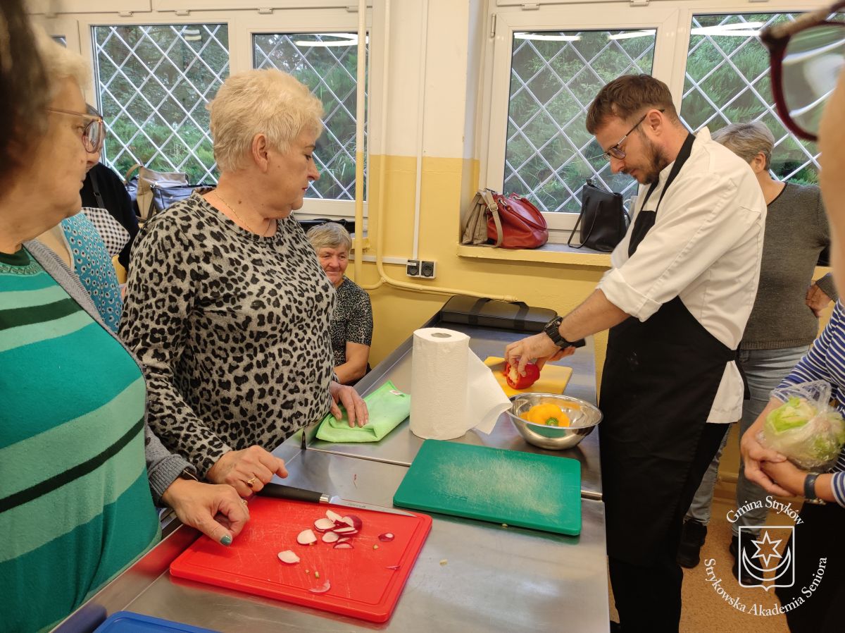 W środę, 1 października 2025 r., odbyły się wyjątkowe zajęcia kulinarne zorganizowane dla Strykowskiej Akademii Seniora. Warsztaty miały miejsce w profesjonalnej pracowni kulinarnej Zespołu Szkół nr 1 w Bratoszewicach, która została udostępniona na potrzeby zajęć, dzięki uprzejmości dyrekcji szkoły. Zajęcia poprowadził pan Artur Nijakowski, mistrz cukiernictwa, który z ogromnym zaangażowaniem dzielił się swoją wiedzą i pasją do gotowania. Pan Artur to doświadczony mistrz cukiernictwa, znany z licznych pokazów i warsztatów kulinarnych. Jego profesjonalizm, otwartość oraz umiejętność pracy z różnymi grupami wiekowymi sprawiły, że zajęcia przebiegły w wyjątkowo serdecznej i inspirującej atmosferze. Jego wiedza oraz ciekawe podejście do gotowania zachwyciły uczestników i dodały zajęciom wyjątkowego charakteru. Pod jego przewodnictwem uczestnicy przygotowali między innymi: